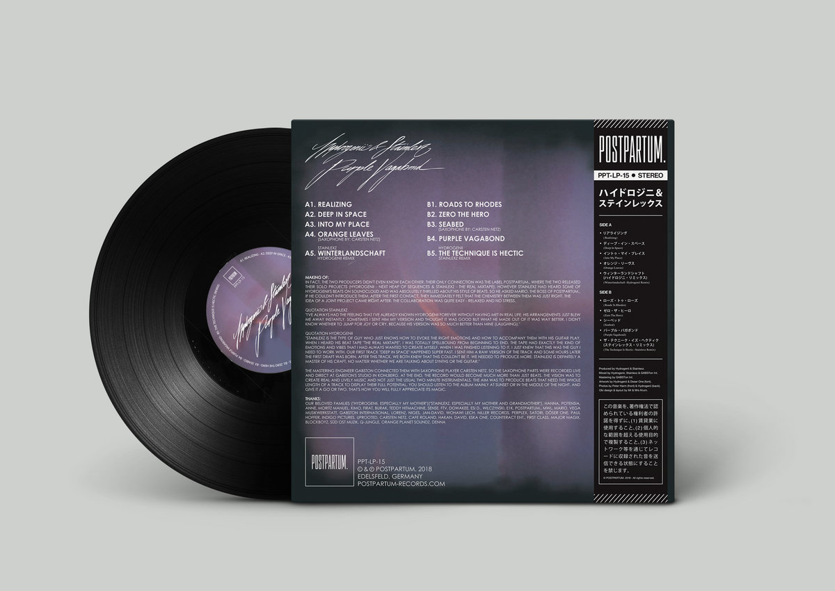 in fact, the two producers didn't even know each other. their only connection was the label POSTPARTUM., where the two released their solo projects (Hydrogenii - Next Heap Of Sequences" & "Stainlexz - The Real Mixtape"). However Stainlexz had heard some of Hydrogenii's beats on soundcloud and was absolutely thrilled about his style of beats. so he asked Mario, the boss of POSTPARTUM., if he couldn't introduce them. after the first contact, they immediately felt that the chemistry between them was just right. the idea of a joint project came right after. the collaboration was quite easy - relaxed and no stress.